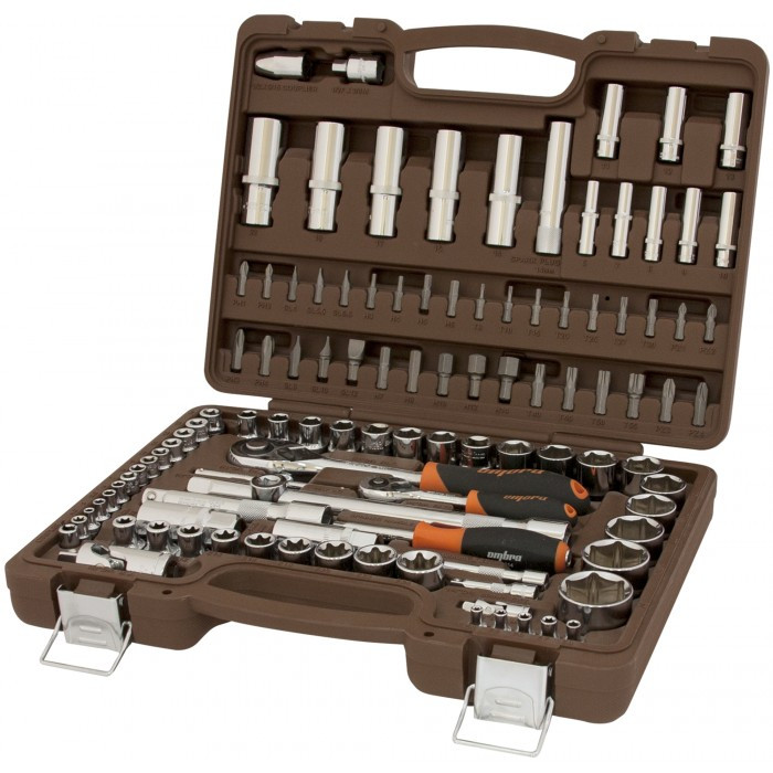 Універсальний набір інструментів OMBRA OMT108S – він стане в нагоді для ремонту і обслуговування автомобілів, кріпильних і монтажних робіт. В комплекті два типи торцевих головок з посадкою і ¼ ½ дюйма. Головки ½ дюйма стандартні, подовжені, також є головки з робочим профілем зовнішній TORX, в комплекті з ними йдуть трещоточные рукояті, подовжувачі і карданні шарніри. Матеріал насадок легована сталь, потрійне покриття захищає від іржі і подряпин, рукоятки виготовлені з двокомпонентного пластику. Крім торцевих головок в комплекті біти різних типів розмірів і рукоятка викрутки. Всього в наборі 108 предметів, набір поставляється в міцному кейсі.